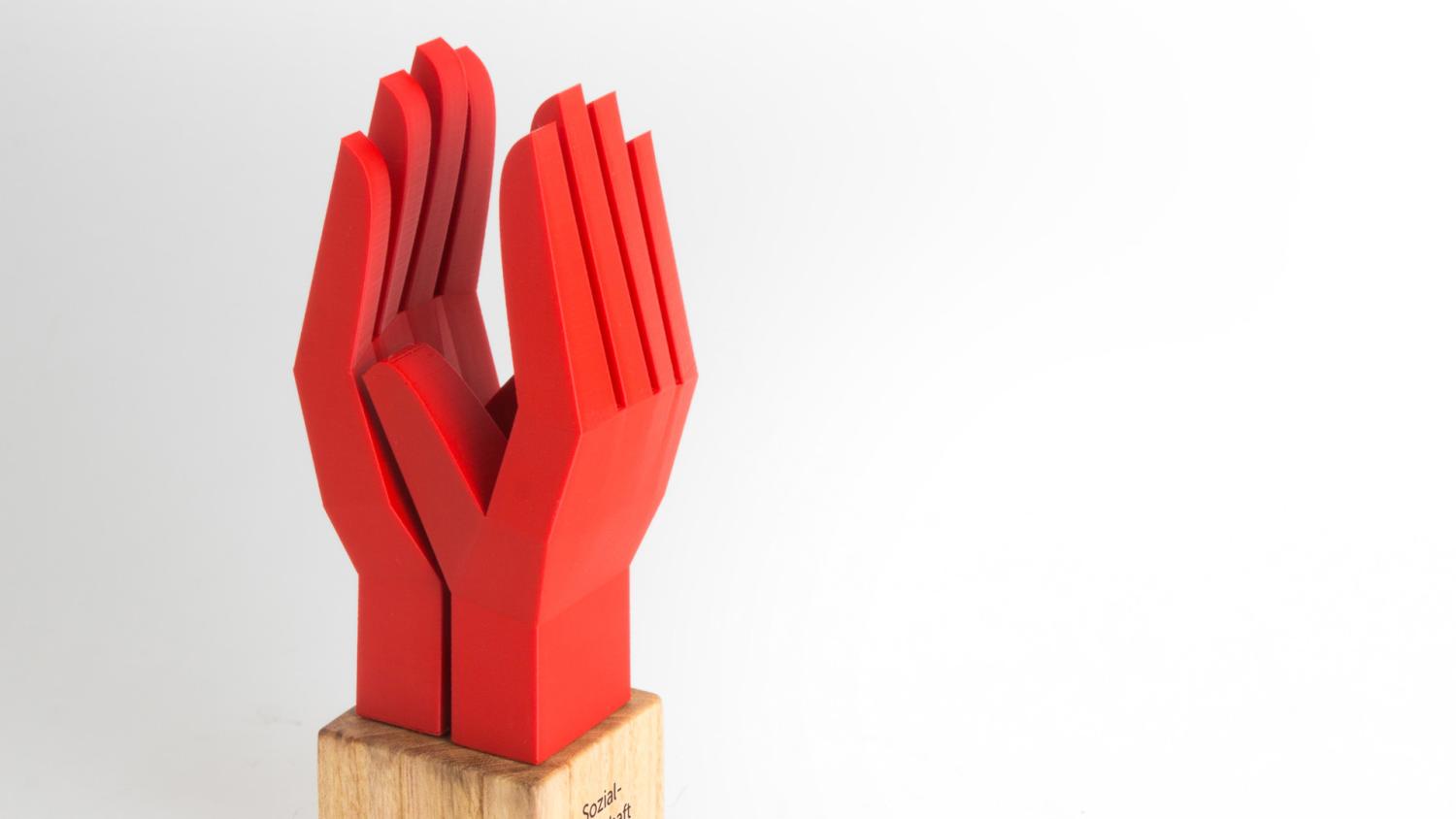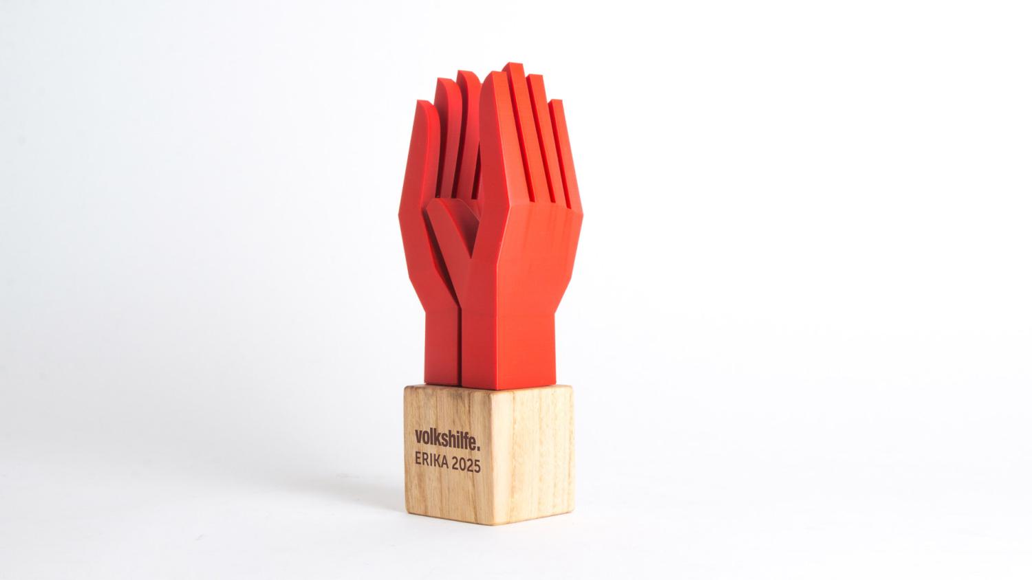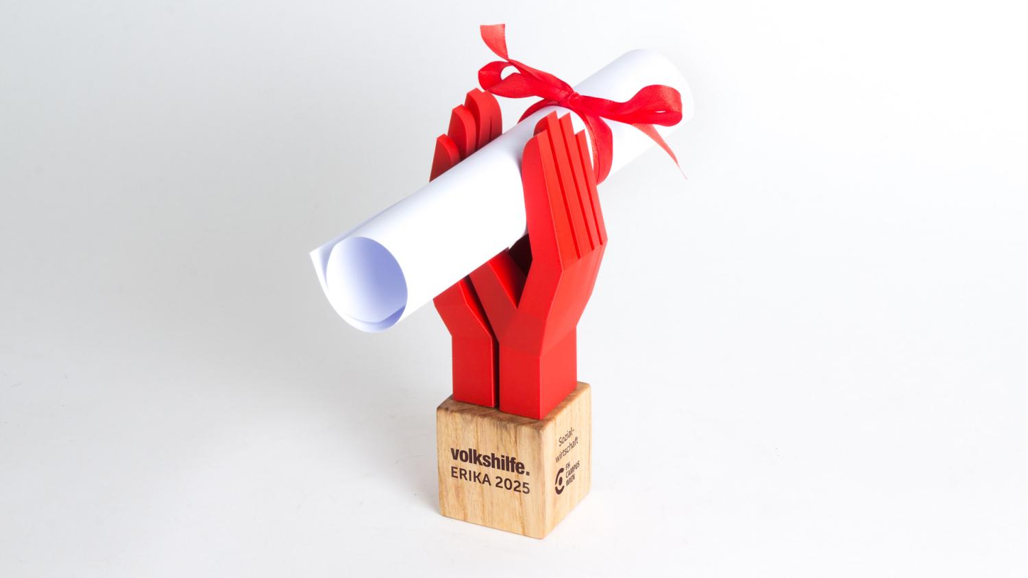 The Erika Preis is an award that recognizes outstanding student work in the fields of social work and nursing sciences of FH Campus Vienna. The design of this award is based on the "Handle With Care" symbol. Since it's about work done by people for people, two right hands of different people were depicted. These two can also hold the certificate.